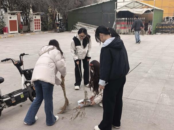 躬身实践,清洁美丽校园。学院组织学生开展清扫校园志愿服务活动,同学们手持清扫工具对道路两侧、绿化带边缘及卫生死角的落叶、杂物进行全面清理,以实际行动为校园环境增色。